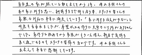 自分達の家がほしいと動き出してから一年。内山木材さんの木の家に対する思い、納得するまで向き合う姿、スタッフの皆さんの柔軟な対応に本当に満足しています。『家に対する注文が少ない』と何度も言われましたが希望以上の造りに文句のつけ所がありませんでした。家造りを始めてから家族がもう一人増え、新居で気持ち良く過ごせるのもスタッフの皆様のおかげです。内山木材さんと出会えて本当に感謝しています。