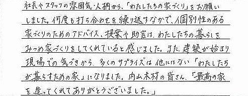 社長やスタッフの雰囲気・人柄から『私たちの家づくり』をお願いしました。何度も打ち合わせを繰り返すなかで個別性のある家づくりのためのアドバイス、提案や助言はわたしたちの暮らしをみつめ家づくりをしてくれていると感じました。また、建築が始まり、現場での気づきから、多くのサプライズは他にはない『私たちが暮らす家』になりました。内山木材の皆さん、『最高の家を造ってくれてありがとうございました』