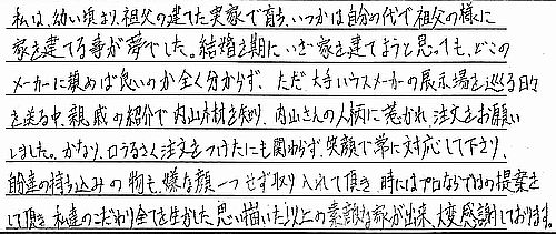 私は幼い頃より、祖父の建てた実家で育ち、いつかは自分の代で祖父のように家を建てる事が夢でした。結婚を機に、いざ家を建てようと思ってもどこのメーカーに頼めばいいのか全くわからず、ただ大手ハウスメーカーの展示場を巡る日々を送る中、親戚の紹介で内山木材さんを知り、内山さんの人柄に惹かれ注文をお願いしました。かなり口うるさく注文を付けたにも関わらず、常に笑顔で対応して下さり、自分達の持ち込みの物も嫌な顔ひとつせず取り入れて頂き、時にはプロならではの提案もして頂き、私達のこだわり全てを生かした、思い描いた以上の素敵な家が出来ました。大変感謝しています。