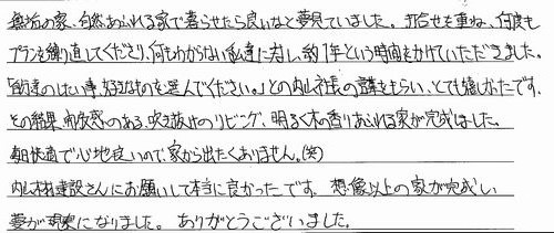 無垢の家、自然あふれる家で暮らせたら良いなと夢見てました。打合せを重ね、何度もプランを練り直してくださり、何も分からない私達に対し、約一年という時間を掛けていただきました。『自分のしたい事、好きなものを選んで下さい』との内山社長の言葉をもらいとても嬉しかったです。その結果、開放感のある、吹抜けのリビング、明るく木の香りあふれる家が完成しました。毎日が快適で心地良いので家から出たくありません(笑)。 内山木材建設さんにお願いして本当に良かったです。想像以上の家が完成し、夢が現実になりました。ありがとうございました。