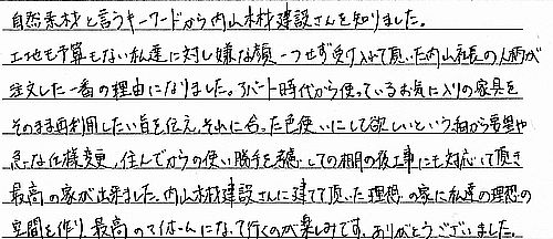 自然素材というキーワードから内山木材建設さんを知りました。土地も予算もない私達に対し、嫌な顔ひとつせず受け入れて頂いた内山社長の人柄が注文した一番の理由になりました。アパート時代から使っているお気に入りの家具をそのまま再利用したい旨を伝え、それに合った色使いにしてほしいという細かな要望や急な仕様変更、住んでからの使い勝手を考慮しての棚の後工事にも対応して頂き、最高の家が出来ました。内山木材建設さんに建てて頂いた理想の家に私達の理想の空間を作り、最高のマイホームになっていくのが楽しみです。ありがとうございました。