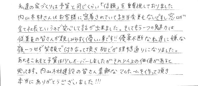私達の家づくりは予算と同じくらい「信頼」を重要視しておりました。内山木材さんはお客様に密着されていて担当の変更もないですし、窓口がすべて社長というので安心して話しが出来ました。そしてもう一つの魅力は従業員の皆さんが親しみやすくやさしい事です!!優柔不断な私達に嫌な顔一つせず笑顔で付き合って頂き殆どが理想通りになりました。あれもこれもと予算は少しオーバーしましたが、それ以上の価値があると思っています。内山木材建設の皆さん素敵なマイホームを作って頂き、本当にありがとうございました!!!