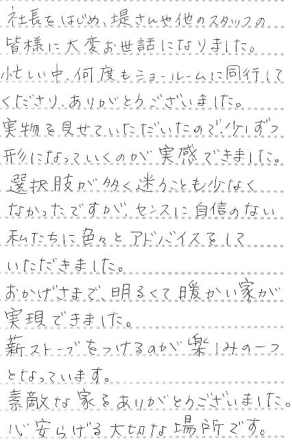社長をはじめ、堤さんや他のスタッフの皆さまに大変お世話になりました。忙しい中、何度もショールームに同行してくださり、ありがとうございました。実物を見せていただいたので少しずつ形になっていくのが実感できました。選択肢が多く、迷うことも少なくなかったですが、センスに自信のない私たちに色々とアドバイスをしていただきました。おかげさまで明るくて暖かい家が実現できました。薪ストーブをつけるのが楽しみの一つとなっています。素敵な家をありがとうございました。心安らげる大切な場所です。