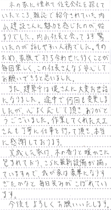 木の家に憧れて住宅会社を探していたところ、雑誌で紹介されていた内山建設さんに魅力を感じたのが始まりでした。内山社長と会ってまず驚いたのが話しやすい人柄でした。その為、家族で打ち合わせに行くことが毎回楽しく、この社長さんなら安心してお願いできると思いました。 また、建築中は堤さんに大変お世話になりました。途中で何回も変更しましたが、快く応じて頂き、ありがとうございました。作業してくれた大工さんも丁寧に仕事を行って頂き、本当に感謝しております。 完成した家は木の香りと暖かさに包まれており、さらに最新設備が揃っていますので我が家は豪華になりすぎたかなと毎日、笑みがこぼれています。 今後もよろしくお願いいたします。