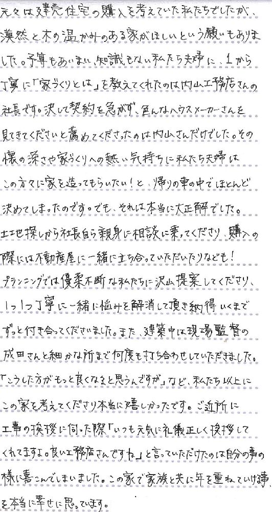 元々は建売住宅の購入を考えていた私たちでしたが、漠然と木の温かみのある家がほしいという願いもありました。予算もあいまい、知識もない私たち夫婦に一から丁寧に「家づくりとは」を教えてくれたのは内山木材さんの社長です。決して契約を急がず、「色んなハウスメーカーさんを見てきてください」と勧めてくださったのは内山さんだけでした。その懐の深さや家づくりの熱い気持ちに私たち夫婦はこの方に家を造ってもらいたいと帰りの車の中でほとんど決めてしまったのです。でも、それは本当に大正解でした。 土地探しから社長自ら親身に相談に乗ってくださり、購入の際には不動産屋に一緒に立ち会っていただいたりなども。 プランニングでは優柔不断な私たちに沢山提案してくださり、一つ一つ丁寧に一緒に悩みを解消して頂き、納得いくまでずっと付き合ってくださいました。また、建築中は現場監督の成田さんと細かな所まで何度も打合せしていただきました。「こうした方がもっと良くなると思うんですが」など私たち以上にこの家を考えてくださり、本当に嬉しかったです。ご近所に工事の挨拶を伺った際「いつも元気に礼儀正しく挨拶してくれてますよ。いい工務店さんですね」と言って頂けたのは自分の事のように喜んでしまいました。この家で家族と共に年を重ねていける事を本当に幸せに思っています。