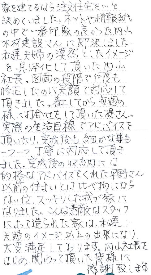 家を建てるなら注文住宅と決めていました。ネットや情報誌の中で一番印象の良かった内山木材建設さんに即決しました。私たち夫婦の漠然としたイメージを具体化して頂いた内山社長。図面の段階で何度も修正したのに笑顔で対応して頂きました。着工してから毎週のように打合せをして頂いた堤さん、実際の生活目線でアドバイスを頂いたり、完成後も細やかな事も一つ一つ丁寧に対応して頂きました。完成後の収納には的確なアドバイスをくれた平野さん。以前の住まいとは比べものにならないくらい、スッキリした我が家になりました。こんな素敵なスタッフによって造られた家は私達夫婦のイメージ以上の出来になり、大変満足しております。内山社長をはじめ、関わって頂いた皆様に感謝いたします。