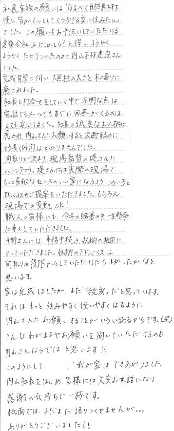 私達家族の願いは『なるべく自然素材を使い皆がホッとしてくつろげる家に住みたい』でした。この願いをお手伝いしていただける建築会社はどこかしら?と探し、ようやくたどり着いたのが内山木材建設さんでした。完成見学に伺い、大黒柱の太さと木の香りに癒されました。社長と打合せをしていく中で不明な点は電話でもメールでもすぐに回答が来るのはとても安心しました。社長の誠実なお人柄に惹かれ、内山さんにお願いすると決断するのに、そう長く時間は掛かりませんでした。 間取りが決まり、現場監督の堤さんにバトンタッチ、堤さんには実際の現場でもっと素敵なセンスのいい家になるよう、いろいろとアドバイスやご提案をいただきました。もちろん現場での変更もOK! 職人の皆様にも今年の酷暑の中、一生懸命仕事をしていただきました。 平野さんには事務手続き、収納の相談に乗って頂きました。収納のアドバイスは間取りの段階からしていただけたら良かったなと思います。 家は完成しましたが、まだ『未完成』だと思っています。それはもっと住みやすく使いやすくなるように内山さんにお願いすることがいろいろあるからです(笑)こんな我がままやお願いを聞いていただけるのも内山さんならではと思います!! このようにして我が家は出来上がりましたが。 内山社長をはじめ、皆様には大変お世話になり、感謝の気持ちでいっぱいです。紙面ではまだまだ語りつくせませんが。。 ありがとうございました。