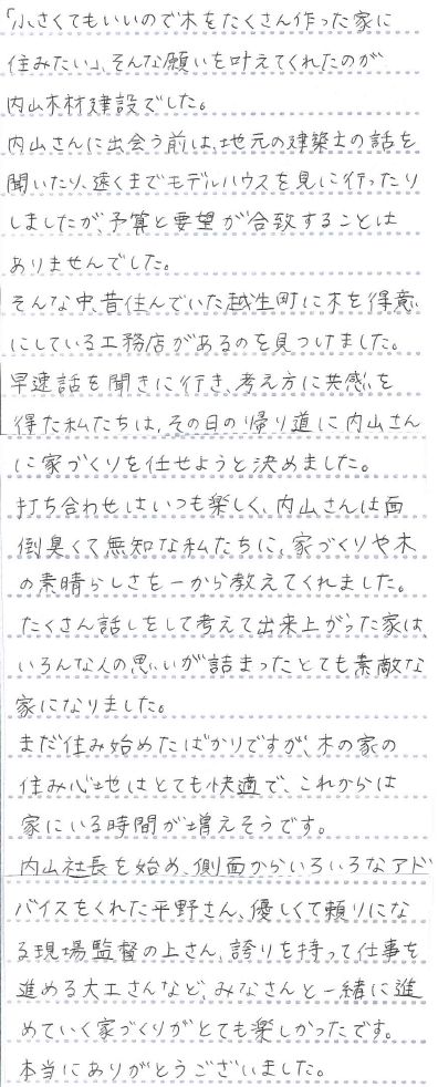 「小さくてもいいので木をたくさん使った家にすみたい」そんな願いを叶えてくれたのが内山木材建設でした。 内山さんに出会う前は、地元の建築士の話しを聞いたり、遠くまでモデルハウスを見に行ったりしましたが、予算と要望が合致することはありませんでした。 そんな中、昔住んでいた越生町に木を得意にしている工務店があることを見つけました。早速、話しを聞きに行き、考え方に共感を得た私たちは、その日の帰り道に内山さんに家づくりを任せようと決めました。 打合せはいつも楽しく、内山さんは、面倒くさくて無知な私たちに家づくりや木の素晴らしさを一から教えてくれました。たくさん話をして考えて出来上がった家は、いろんな人の思いが詰まったとても素敵な家になりました。 まだ住み始めたばかりですが、木の家の住み心地はとても快適で、これからは家にいる時間が増えそうです。 内山社長をはじめ、側面からいろいろなアドバイスをくれた平野さん、優しくて頼りになる現場監督の上さん、誇りを持って仕事を進める大工さんなど、みなさんと一緒に進めていく家づくりがとても楽しかったです。 本当にありがとうございました。