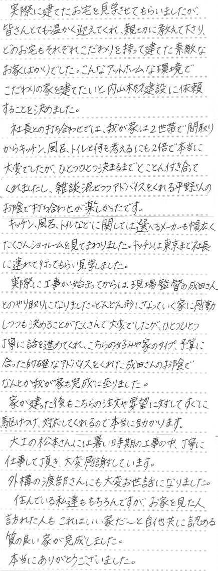 実際に建てたお宅を見学させてもらいましたが、皆さんとても温かく迎えてくれ、親切に教えてくださり、どのお宅もそれぞれこだわりを持って建てた素敵なお家ばかりでした。こんなアットホームな環境でこだわり家を建てたいと内山木材建設に依頼することを決めました。 社長との打合せでは、我が家は2世帯で間取りからキッチン、風呂、トイレと何を考えるにも2倍で本当に大変でしたが、ひとつひとつ決まるまでとことん付き合ってくれましたし、雑談混ぜつつアドバイスをくれる平野さんのお陰で打合せが楽しかったです。 キッチン、風呂、トイレなどに関しては選べるメーカーも幅広く、たくさんのショールームを見てまわりました。キッチンは東京まで社長に連れて行ってもらい見学しました。 実際に工事が始めってからは、現場監督の成田さんとのやり取りになりました。どんどん形になっていく家に感動しつつも決めることがたくさんで大変でしたが、ひとつひとつ丁寧に話を進めてくれ、こちらの好みや家のタイプ、予算に合った的確なアドバイスをくれた成田さんのお陰でなんとか我が家も完成に至りました。 家が建った後もこちらの注文や要望に対してすぐに駆け付け、対応してくれるので本当に助かります。 大工の松本さんには暑い時期の工事の中、丁寧に仕事して頂き、大変感謝しています。 外構の渡部さんにも大変お世話になりました。 住んでいる私達ももちろんですが、お家を見た人、訪れた人も「これはいい家だ~」と自他共に認める質のいい家が完成しました。 本当にありがとうございました。
