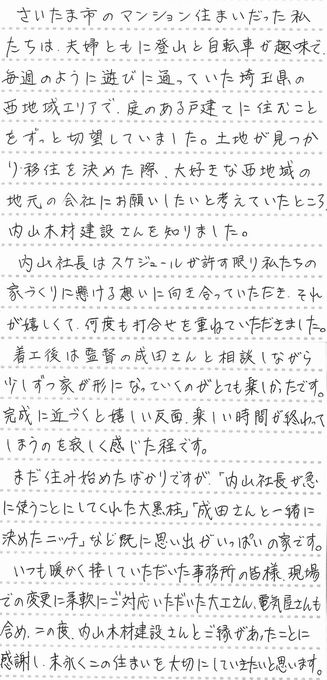 さいたま市のマンション住まいだった私たちは、夫婦ともに登山と自転車が趣味で、毎週のように遊びに通っていた埼玉県の西地区エリアで庭のある戸建てに住むことをずっと切望していました。土地が見つかり、移住を決めた際、大好きな西地域の地元の会社にお願いしたいと考えていたところ、内山木材建設さんを知りました。 内山社長はスケジュールが許す限り、私たちの家づくりに懸ける思いに向き合っていただき、それが嬉しくて何度も打合せを重ねていただきました。 着工後は監督の成田さんと相談しながら少しずつ家が形になっていくのがとても楽しかったです。完成に近づくと嬉しい反面、楽しい時間が終わってしまうのを寂しく感じたほどです。 まだ住み始めたばかりですが、「内山社長が急に使う事にしてくれた大黒柱」、「成田さんと一緒に決めたニッチ」など既に思い出がいっぱいの家です。 いつも温かく接していただいた事務所の皆さま、現場での変更に柔軟にご対応いただいた大工さん、電気屋さんも含め、この度、内山木材建設さんとご縁があったことに感謝し、末永くこの住まいを大切にしていきたいと思います。