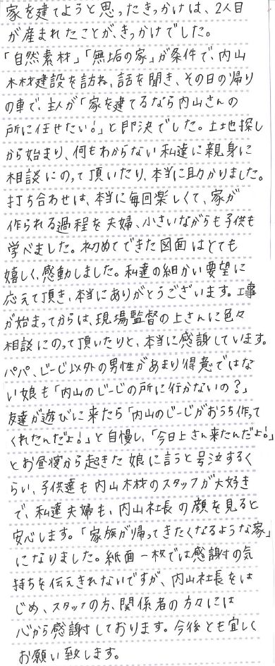 家を建てようと思ったきっかけは二人目が生まれたことがきっかけでした。「自然素材」「無垢の家」が条件で内山木材建設を訪ね、話しを聞き、その日の帰りの車の中で、主人が「家を建てるなら内山さんに任せたい!」と即決でした。土地探しから始まり、何もわからない私たちに親身に相談に乗って頂いて本当に助かりました。 打合せは本当に毎回楽しくて、家が作られる過程を夫婦、小さいながらも子供も学べました。初めて出来た図面はとても嬉しく、感動しました。私達の細かい要望に応えていただき、本当に有難うございました。工事が始まってからは現場監督の上さんに色々相談に乗って頂いたりと本当に感謝しています。 パパ、じーじ以外の男性があまり得意ではない娘も「内山のじーじの所に行かないの?」友達が遊びに来たら「内山のじーじがおうち作ってくれたんだよ」と自慢し、「今日は上さん来たんだよ」とお昼寝から起きた娘に言うと号泣するくらい子供たちも内山木材建設のスタッフが大好きで、私たち夫婦も内山社長の顔を見ると安心します。「家族が帰りたくなる家」になりました。紙面一枚では感謝の気持ちを伝えきれないですが、内山社長を始め、スタッフの方、関係者の方々には心から感謝しております。今後とも宜しくお願い致します。