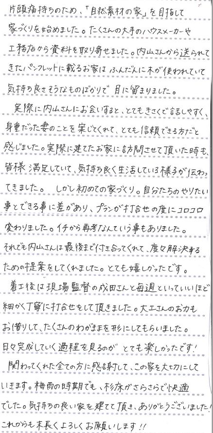 片頭痛持ちの為、「自然素材の家」を目指して家づくりを始めました。たくさんの大手ハウスメーカーや工務店から資料を取り寄せました。内山さんから送られてきたパンフレットに載るお家はふんだんに木が使われていて気持ち良さそうなものばかりで目に留まりました。 実際に内山さんにお会いするととても気さくで話しやすく、身重だった妻の事を案じてくれてとても信頼できる方だと感じました。実際に建てたお家に訪問させていただいた時も皆さま満足していて、気持ち良く生活している様子が伝わってきました。しかし、初めての家づくり。自分たちのやりたい事と出来る事に差があり、プランが打合せの度にコロコロ変わりました。イチから再考なんていう事もありました。それでも内山さんは最後まで付き合ってくれて、度々解決する為の提案をしてくれました。とても嬉しかったです。 着工後は現場監督の成田さんと毎週と言っていいほど細かく丁寧に打合せをして頂きました。大工さんのお力もお借りしてたくさんの我がままをカタチにしてもらいました。 日々完成していく過程を見るのがとても楽しかったです! 関わってくれた全ての方に感謝して、この家を大切にしていきます。梅雨の時期でも杉床がサラサラで快適でした。気持ちのいい家を建てて頂き、ありがとうございました!これからも末永くよろしくお願いします!!