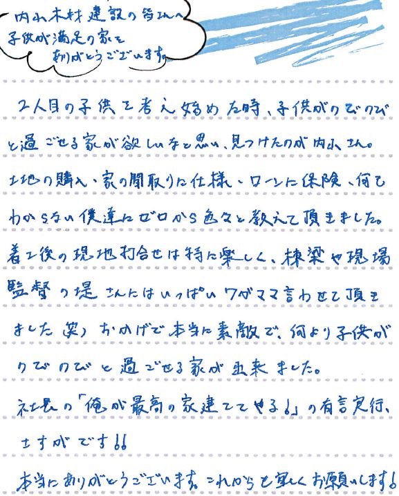 二人目の子供を考え始めた時、子供がのびのびと過ごせる家がほしいなと思い、見つけたのが内山さん。 土地の購入、家の間取りに仕様、ローンに保険、何もわからない僕達にゼロから色々と教えていただきました。 着工後の現地打合せは特に楽しく、棟梁や現場監督の堤さんにはいっぱい我がままを言わせていただきました(笑)。おかげで本当に素敵で何より子供がのびのびと過ごせる家が出来ました。 社長の「俺が最高の家を建ててやる!」の有言実行は流石です。 本当にありがとうございました。これからもよろしくお願いします!